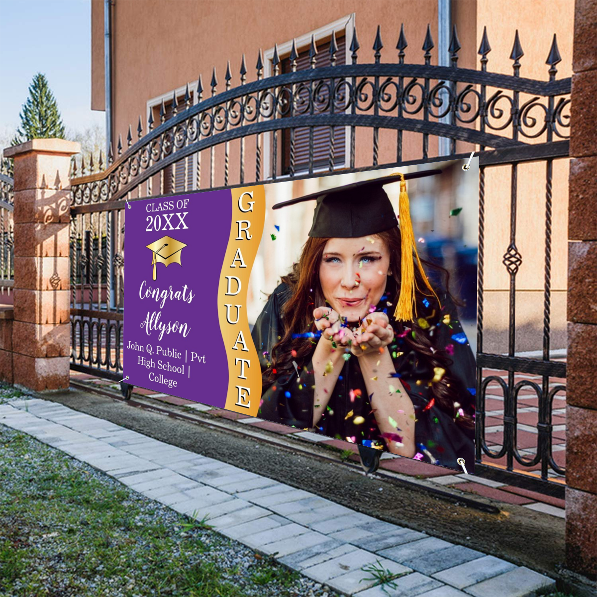 - HIGH-QUALITY: The graduation hanging banner is made of highly dense fabrics. Sturdy and durable as college graduation door decorations. Colors don't fade in rains.