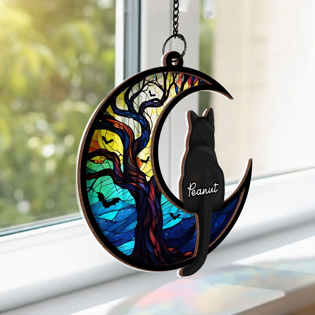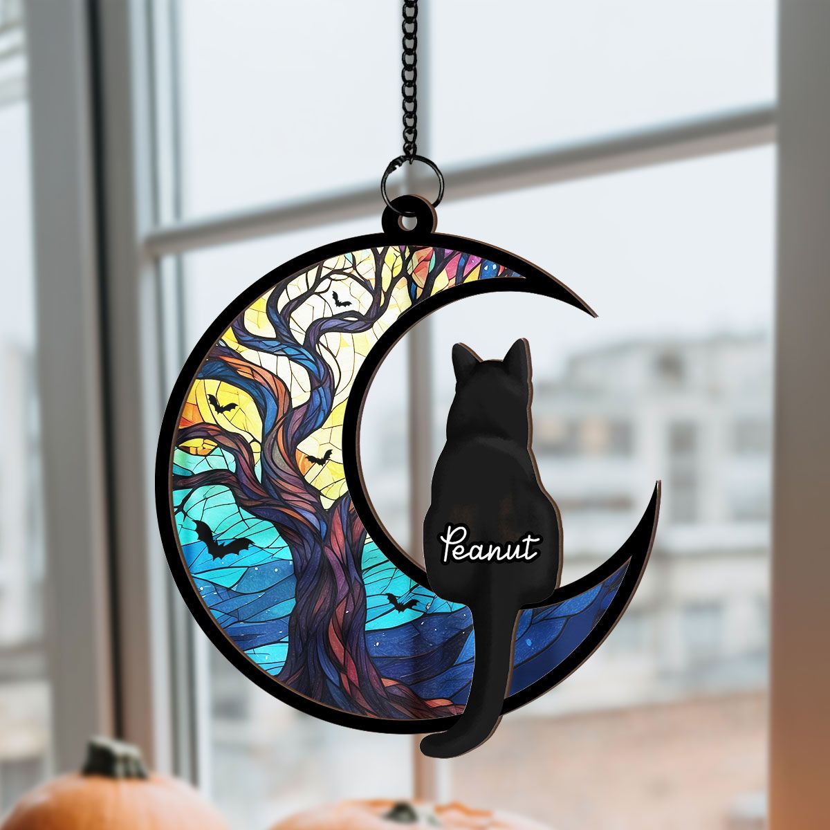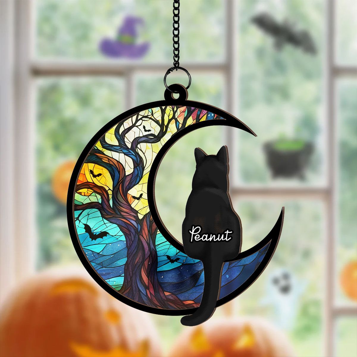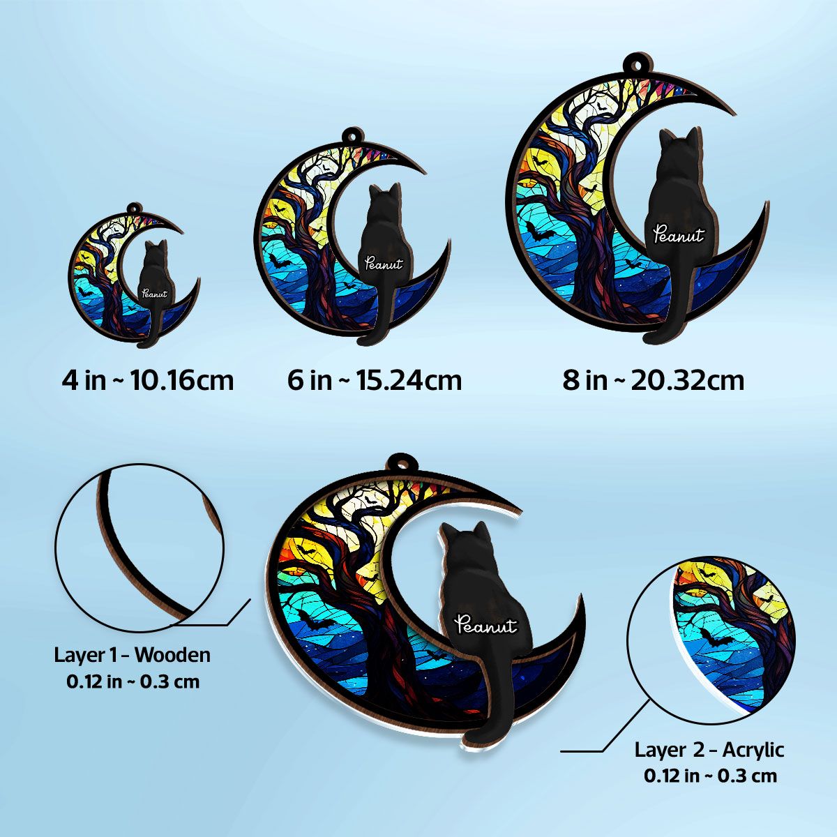 Cats On Moon Personalized Window Hanging Suncatcher, Halloween Decor For Cat Lovers