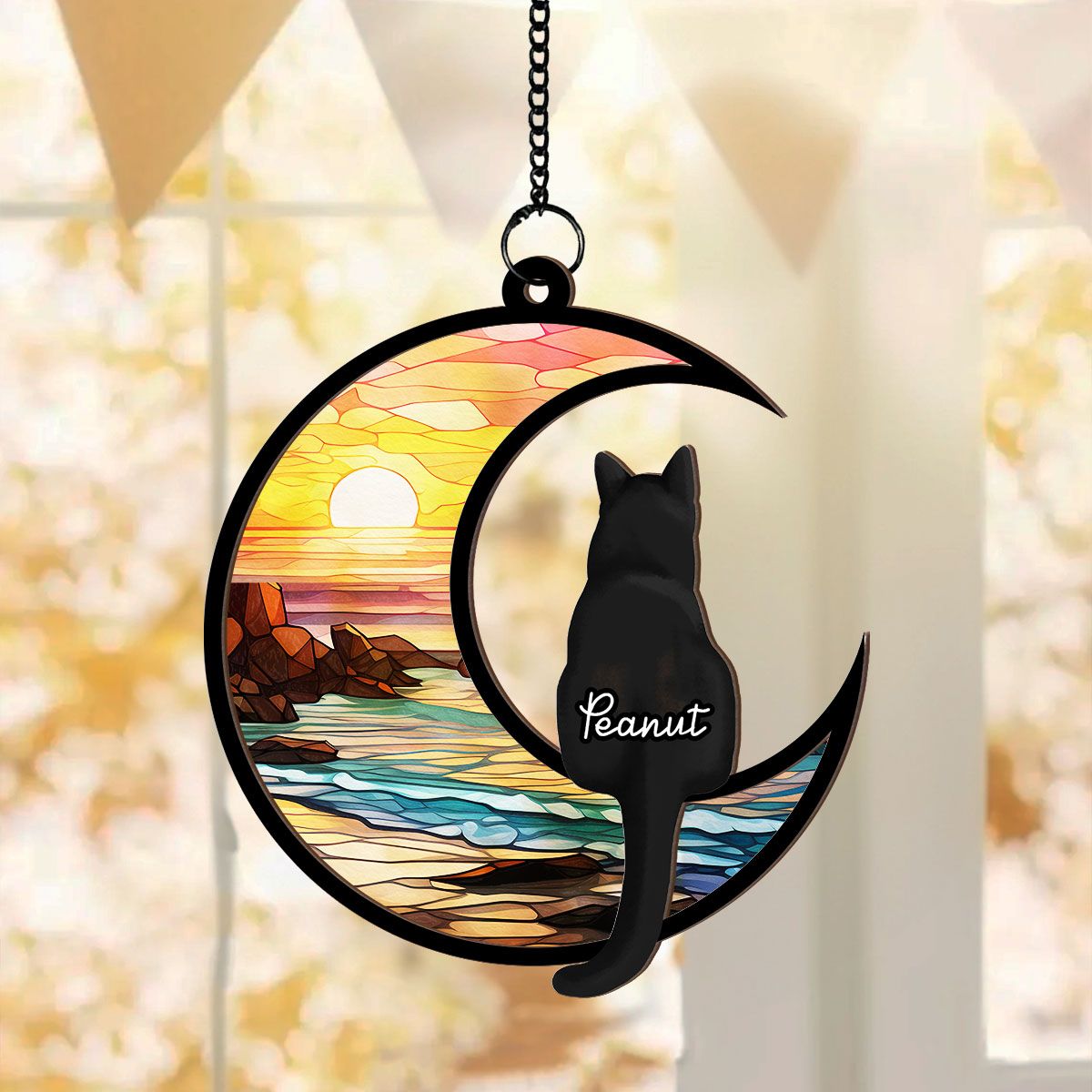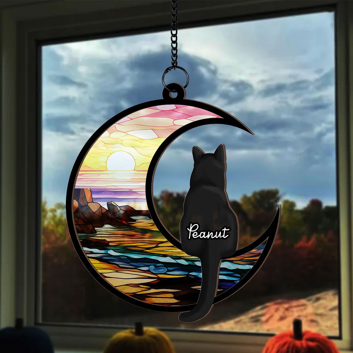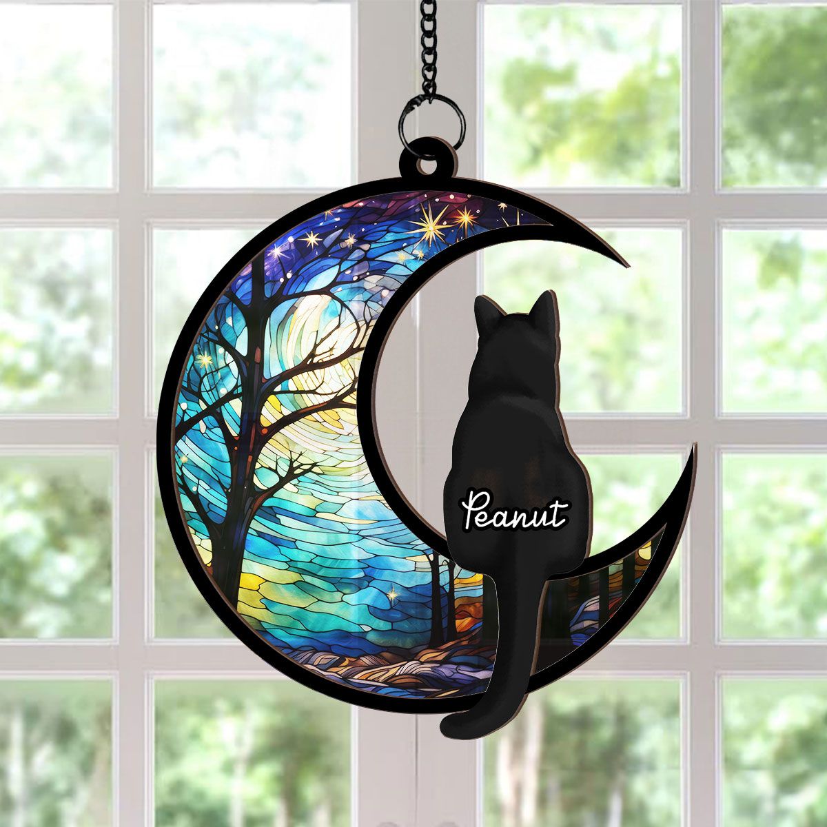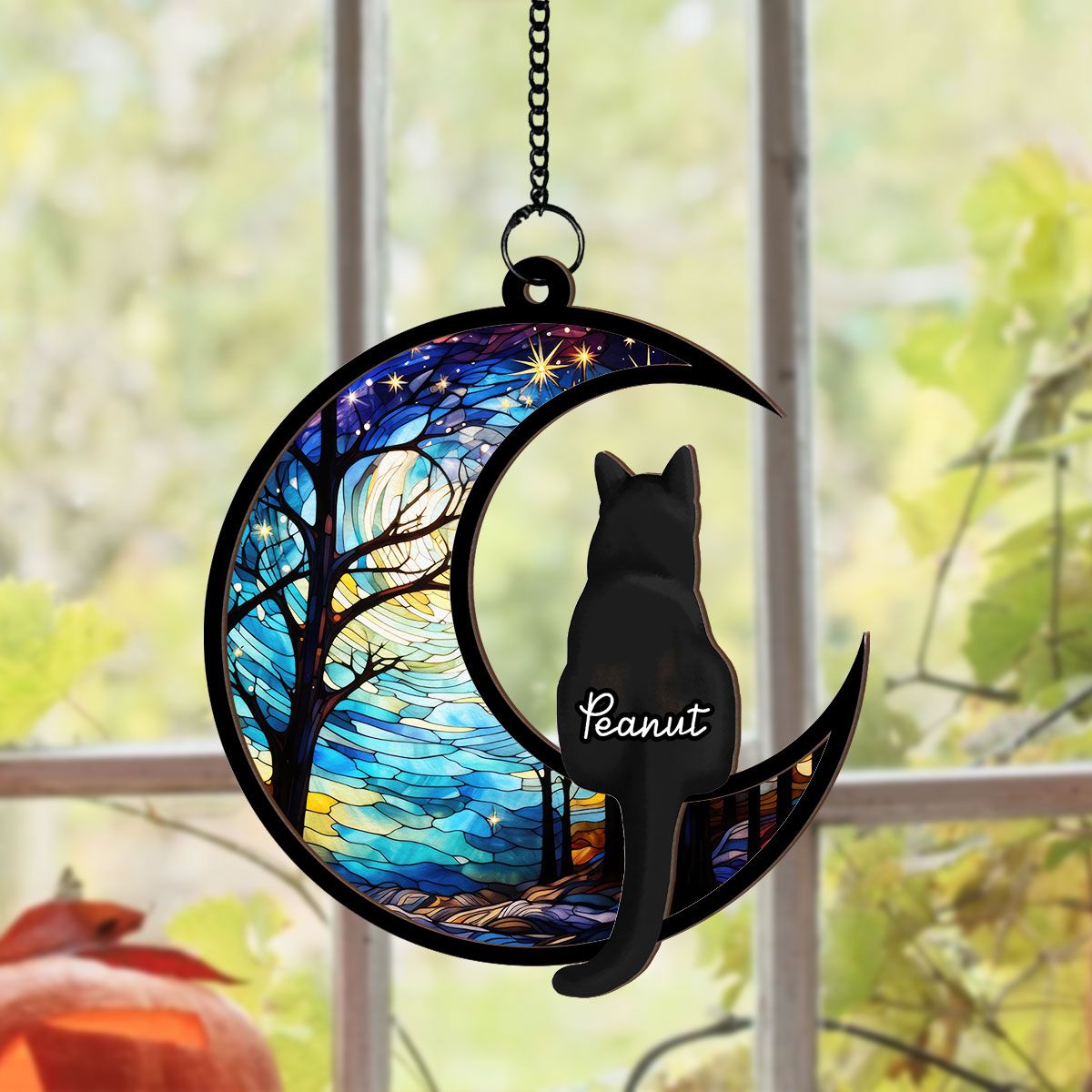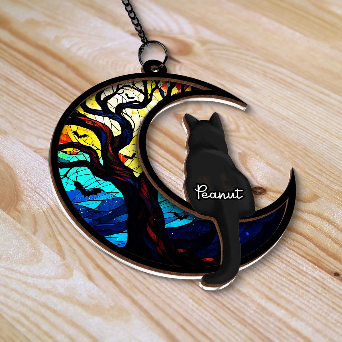 Cats On Moon Personalized Window Hanging Suncatcher, Halloween Decor For Cat Lovers