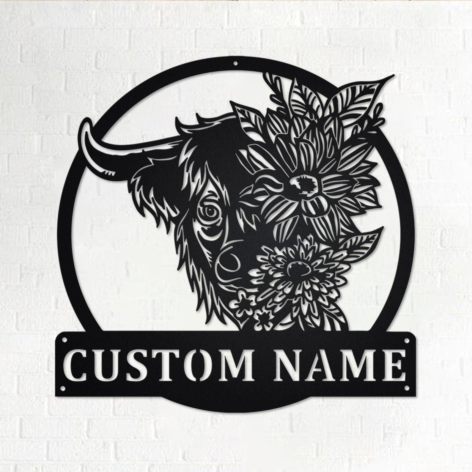 Custom Floral Highland Cow Metal Wall Art, Personalized Highland Cow Name Sign Decoration For Room