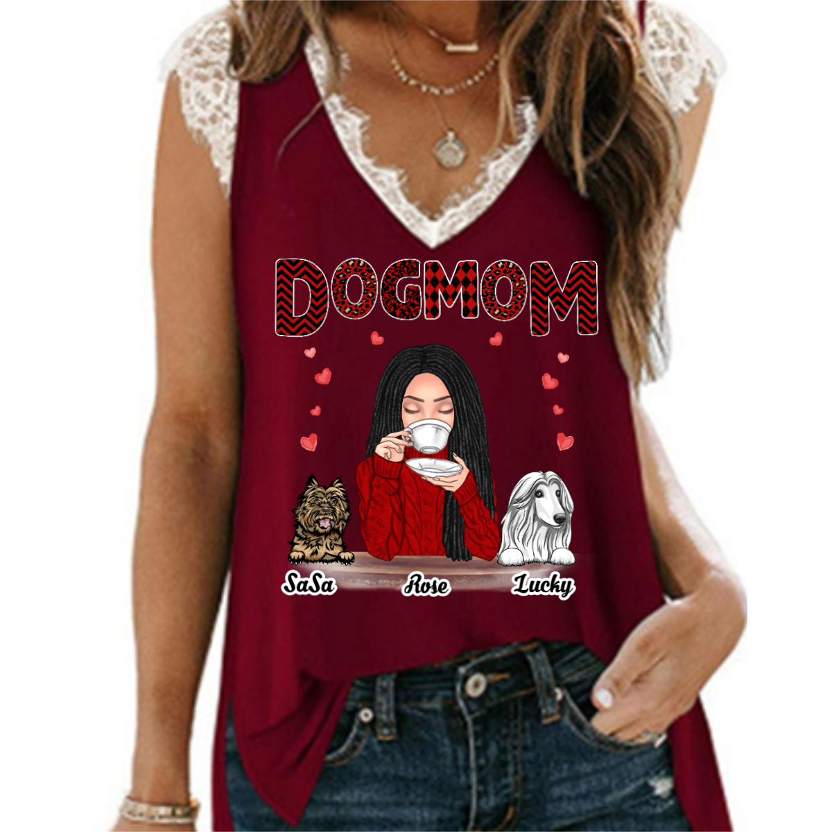 Dog Mom Red Patterned Personalized Women Tank Top V Neck Lace