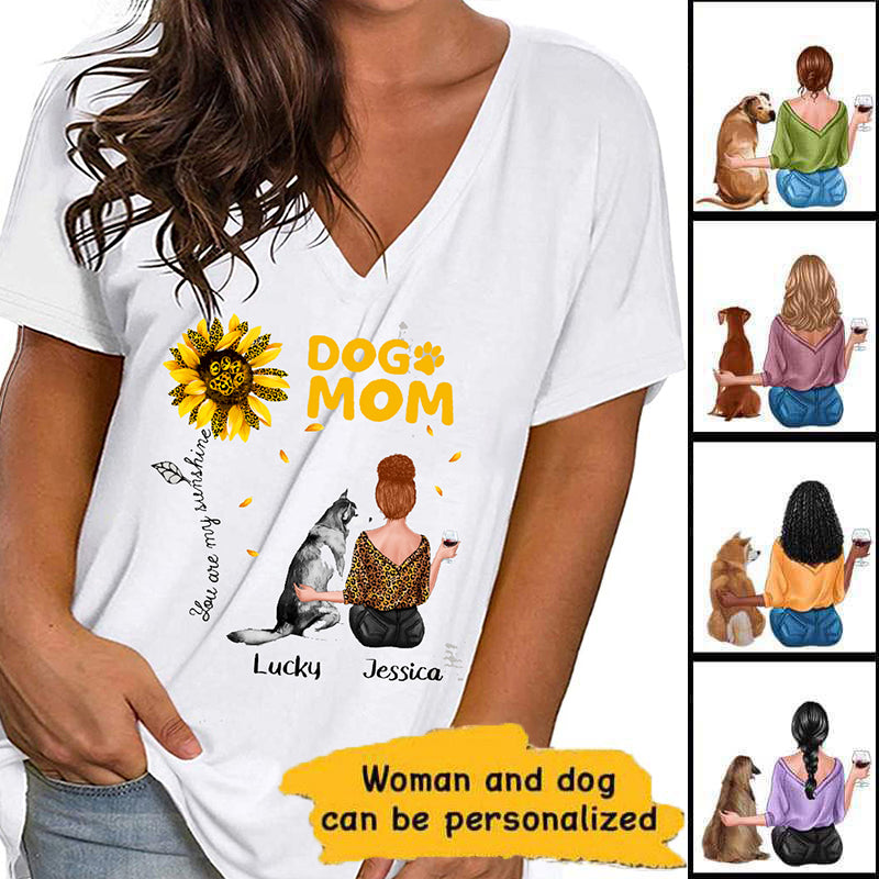 Dog Mom Sunflower Leopard Personalized Womens Short Sleeve Tops V Neck Casual Flowy