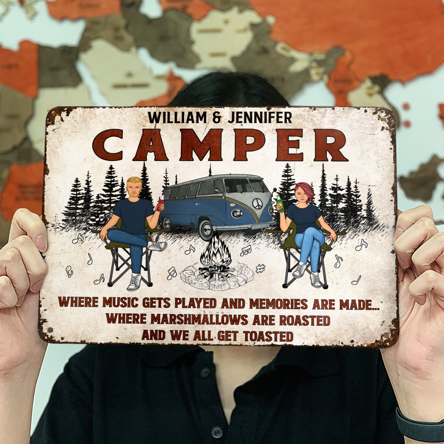Family Couple Camping Firepit Where Music Gets Played - Personalized Custom Classic Metal Signs