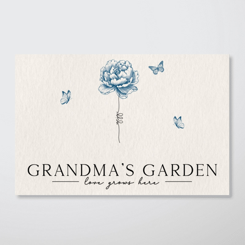 Grandma's Garden Love Grows Here Blue Vingtage Birthmonth Flowers Personalized Canvas, Grandkids Names Floral Gift