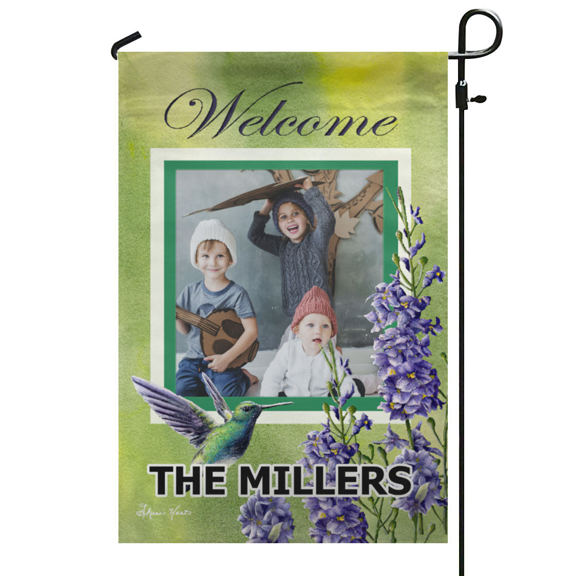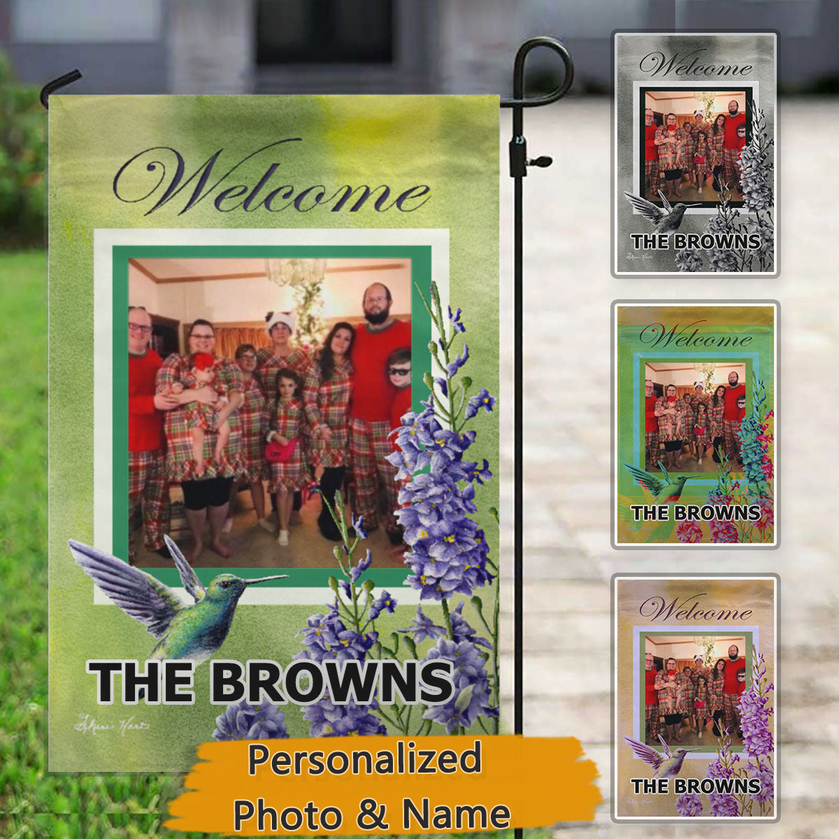 Hummingbird Welcome – Personalized Photo & Family Name Garden & House Flag
