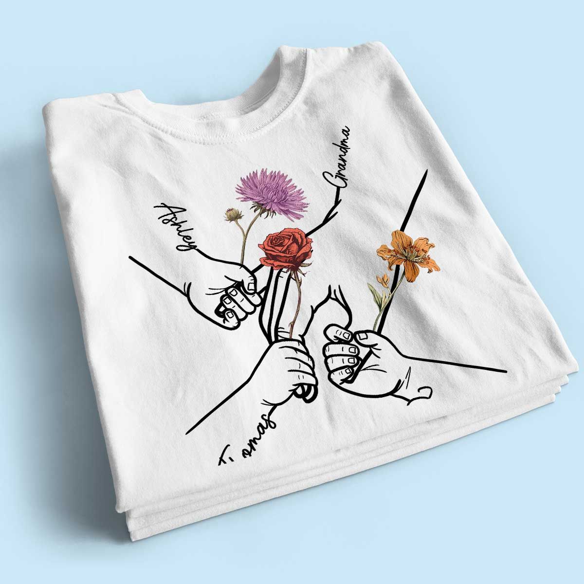 Kids Holding Grandma Mom Hand Birth Month Flowers Personalized Shirt
