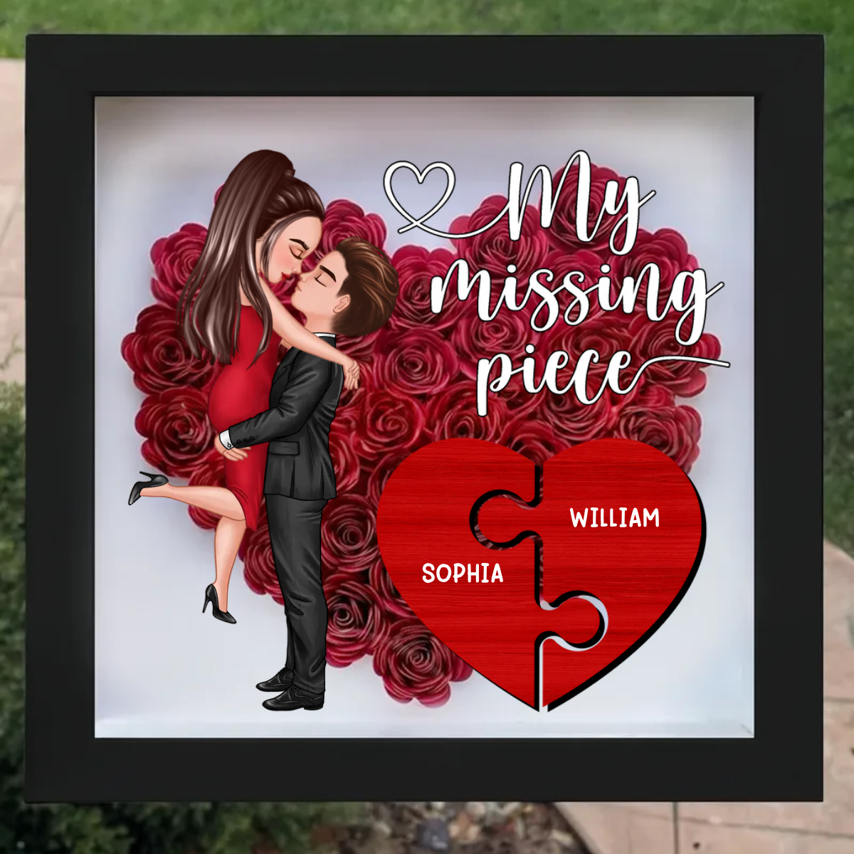 My Missing Piece Doll Couple Hugging Kissing Heart Piece Personalized Heart Rose Shadow Box