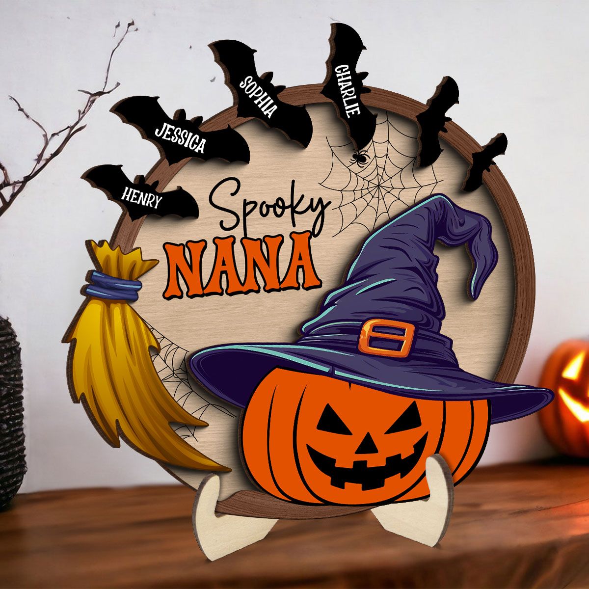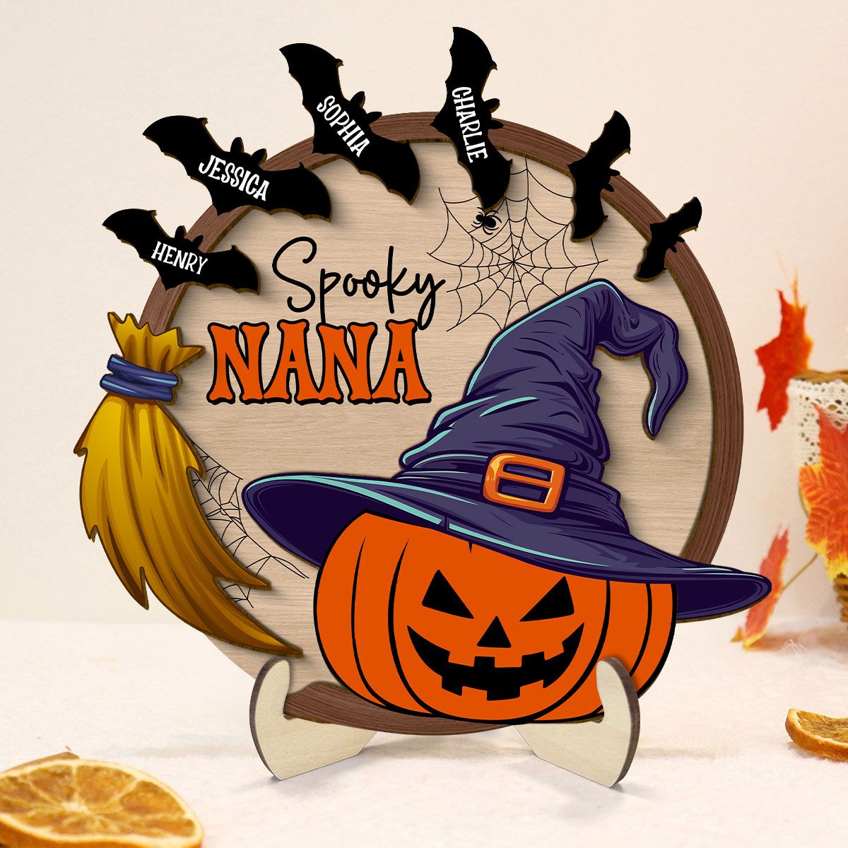 Spooky Grandma Mom Pumpkin Witch Hat Personalized 2-Layer Standing Wooden Plaque, Halloween Decor
